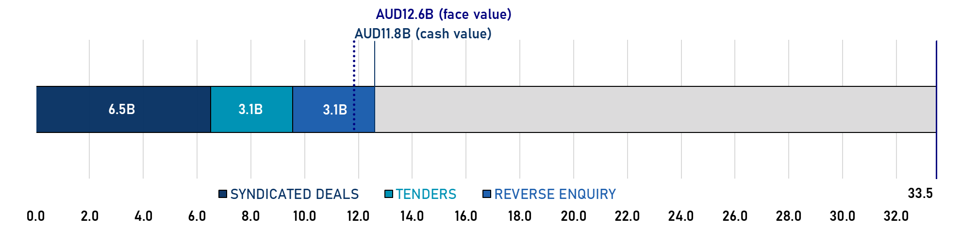 • AUD Benchmark Bonds: The principal source of funding, including new AUD 2038 or longer maturities.